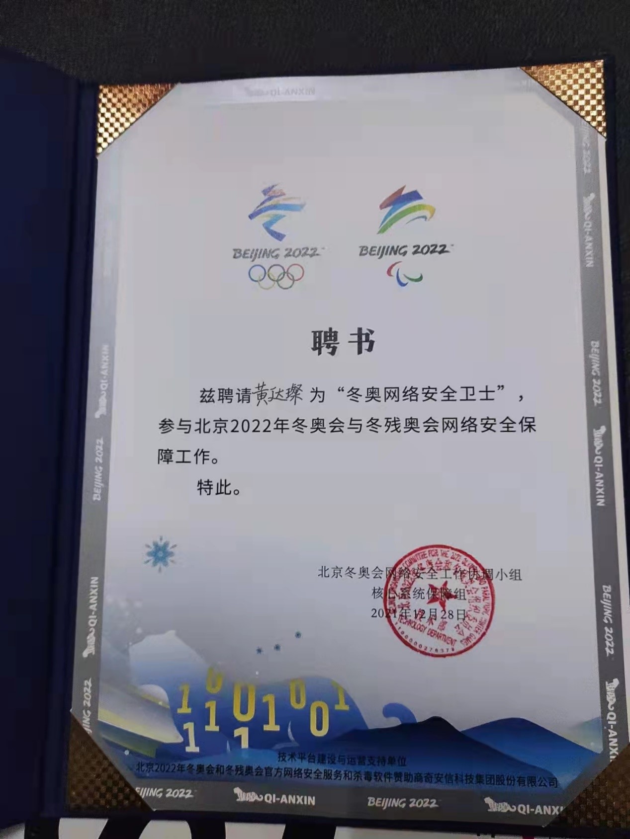 在北京冬奥会、冬残奥会期间,我校9999js金沙老品牌2018级学生黄达璨受聘于北京冬奥组委会技术部,成为“冬奥网络安全卫士”,为相关赛事网站及系统提供安全评估与保障。