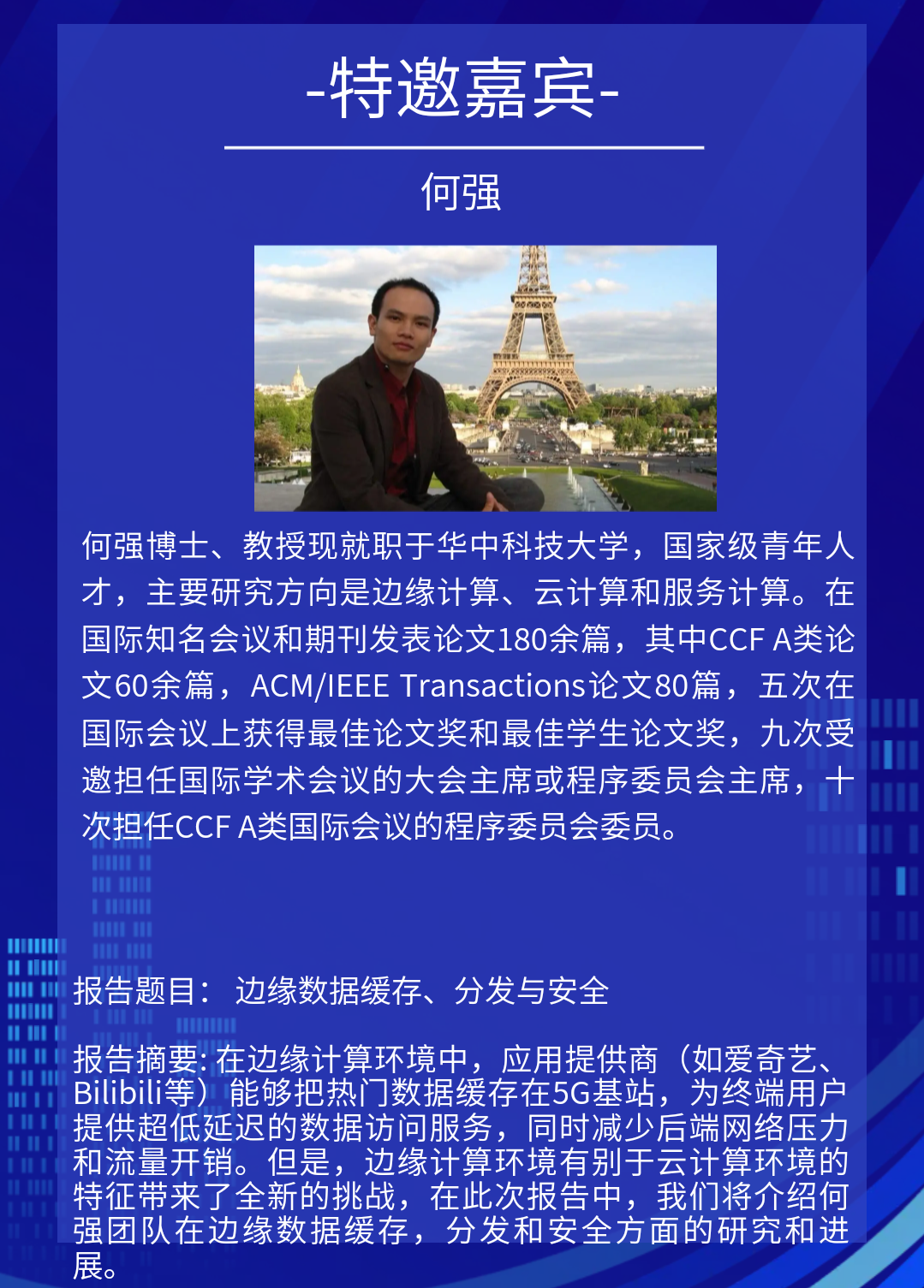 本次活动特邀请了华中科技大学国家级青年人才何强教授到校作学术报告。报告的名称为“边缘数据缓存、分发与安全”,此次报告主要讲述在边缘计算环境中,应用提供商(如爱奇艺、Bilibili等)能够把热门数据缓存在5G基站,为终端用户提供超低延迟的数据访问服务,同时减少后端网络压力和流量开销。但是,边缘计算环境有别于云计算环境的特征带来了全新的挑战。在此次报告中,我们将介绍何强团队在边缘数据缓存,分发和安全方面的研究和进展。